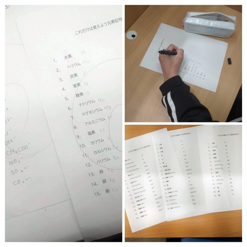 授業以外に、中3生はイオン記号、中3生は元素記号・化学式の暗記を課題としています。